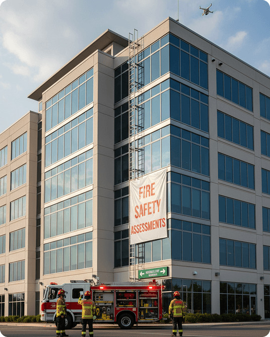 We assess external wall systems, balconies, cladding and insulation, bin storage, arson risk points, fire service access and lighting around exits.